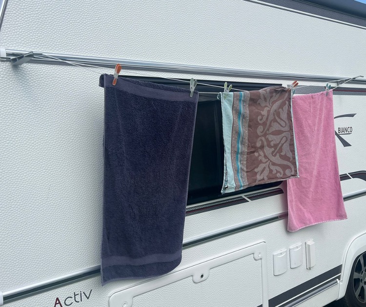 Die Campline- Wäscheleine hängt innerhalb von 20 Sekunden und ist innerhalb von 20 Sekunden wieder gereinigt. Ideal zum Campen!